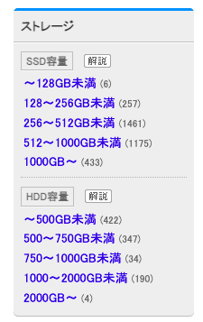 ストレージについても、価格ドットコムでは検索フィルターに用意されています。